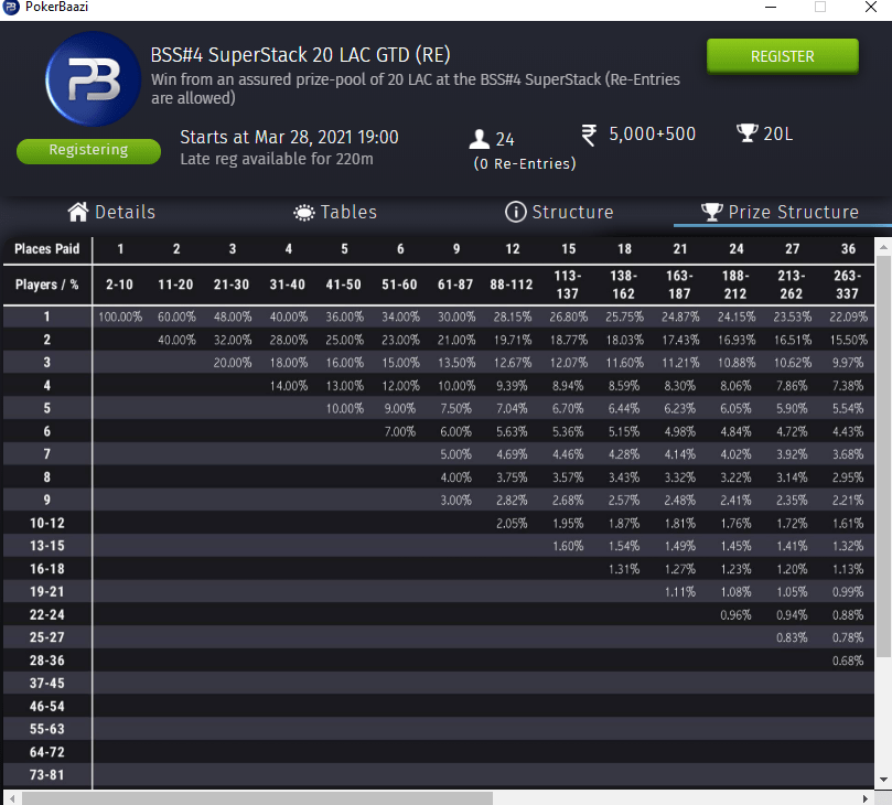 Below is the prize distribution structure of a tournament on Pokerbaazi with an entry fee of Rs 5,000 and Rs 500 as organizing fee or ‘rake’.